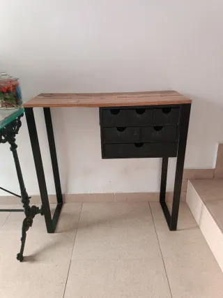 Elegante mesa recibidor con un diseño moderno y funcional. - Tablero de madera con acabado natural. - Estructura metálica robusta. - Cajonera integrada con varios compartimentos.