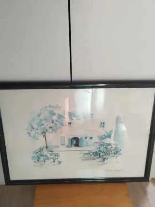 Preciosa acuarela original que representa una casa con un árbol. - Técnica: Acuarela. - Colores predominantes: azul y blanco.