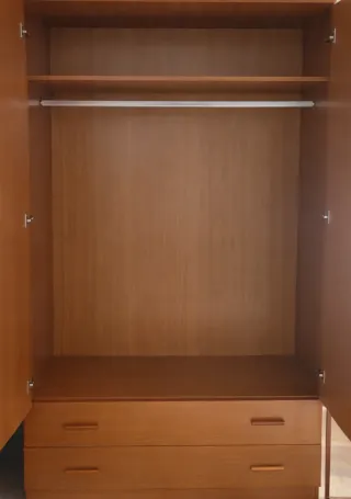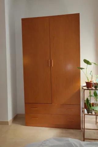 Armario de madera con acabado color madera de cerezo de tamaño compacto ideal para espacios reducidos. Cuenta con dos puertas principales y dos cajones inferiores. En su interior tiene un estante alto y una barra para colgar la ropa. Está perfecto sólo tiene un pequeño defecto en la esquina superior (ultima foto) y el único problema es que una de las bisagras no está bien ajustada y por tanto esa puerta está más alta y roza (se aprecia en la foto) pero eso se arregla ajustando los tornillos de la cazoleta (la bisagra). Medidas: Alto: 200cm Ancho: 100cm Profundidad: 52cm También vendo dos mesitas de noche del mismo color y estilo.