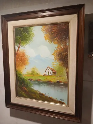 Cuadro al óleo pintado a mano con paisaje clásico de casa, lago y montañas. Obra firmada (Matías). No es lámina, es pintura original sobre lienzo. Marco de madera en buen estado general. Ideal para salón, casa rústica o decoración tradicional. Se vende tal cual aparece en las fotos