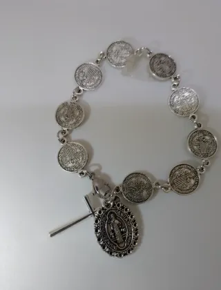 Pulsera con medallas de San Benito y un colgante de la Virgen María y una cruz. - Material: Aleación de zinc.