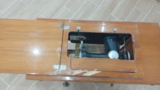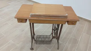 Mesa de madera con compartimento para máquina de coser. - Tapa abatible con bisagras. - Acabado en madera natural.