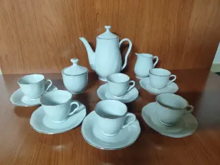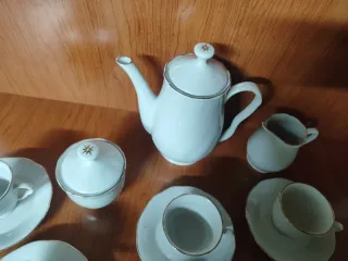 Elegante juego de café de porcelana con detalles playeados - Incluye tetera, azucarero y lechera. - Diseño clásico con borde plateados