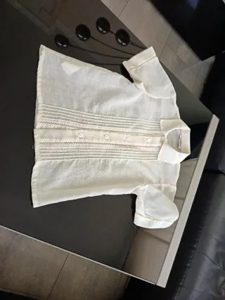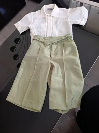 Conjunto de vestir para niño, ideal para ocasiones especiales. La camisa es blanco roto con detalles de puntadas y la parte delantera plisada. El pantalón es de color verde claro, con un acabado brillante y cinturón a juego. - Camisa de manga corta. - Pantalón corto con cinturón.