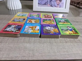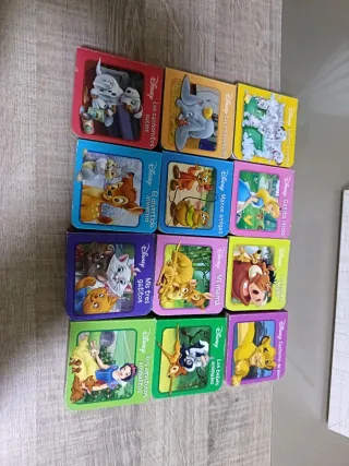 12 cuentos en miniatura, de tapa dura, de Disney. A partir de los 10 meses. Vienen en su cajista, lo único que la caja está un poquito rota.