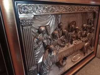 Detalle de La Última Cena en relieve, una pieza decorativa con un diseño clásico. 80cm x 58cm - Representación en relieve de la escena. - Marco con detalles dorados y negros.