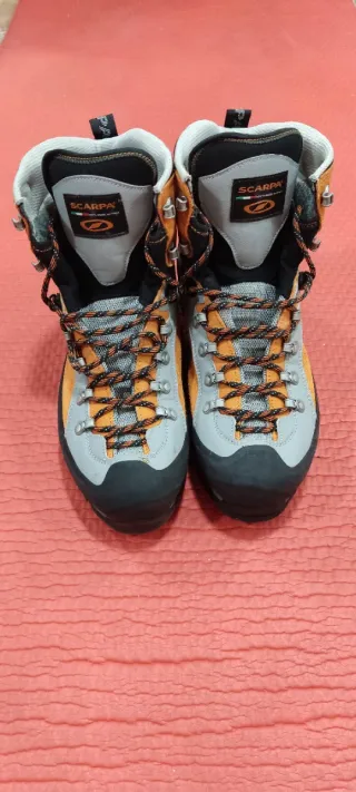Botas de montaña Scarpa en color naranja y gris. Estan usadas solamente una vez para probarlas. - Cierre con cordones. - Caña alta. - Suela de goma.
