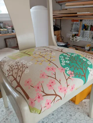 Silla de madera con un diseño único y un tapizado vibrante. Epoca 1970 - Patas y estructura de madera. - Asiento con estampado de árboles y flores.