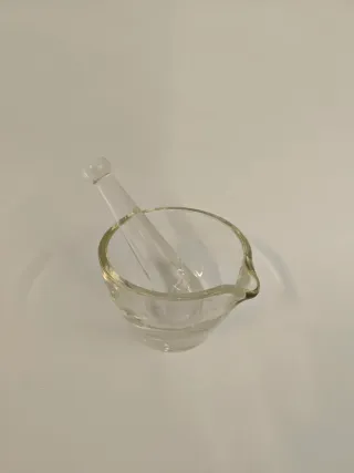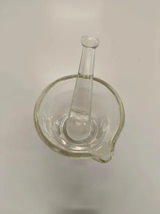 Mortero original de vidrio de laboratorio con mano (pistilo) a juego. Pieza técnica, no de cocina, usada tradicionalmente en laboratorios, farmacias y centros de enseñanza para triturar y mezclar sustancias. Fabricado en vidrio grueso y pesado, con pico vertedor integrado. Conjunto completo y bien conservado, sin roturas ni fisuras visibles. Medidas: Diámetro del mortero: 10 cm Altura del mortero: 7,5 cm Longitud de la mano: 12,5 cm Ideal para coleccionismo científico, decoración tipo laboratorio vintage o uso técnico controlado.