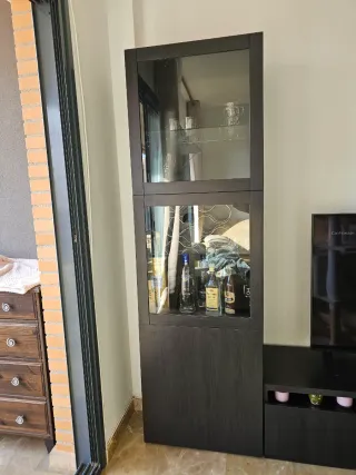 Mueble de salón versátil que se puede usar junto o por separado. 1 Vitrina alta, 1 Vitrina baja y 1 mueble tv Mueble tv 1.80 largo 40 profundidad 38 alto Vitrina grande 1.90 alto 60 ancho 40 de profundidad Vitrina pequeña 1.27 de alto 60 ancho 40 profundidad Las vitrinas estan ancladas a la pared. La puerta de la Vitrina pequeña está un poco descuadrada. Solo recogida. Quien recoge lo desmonta.