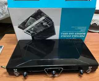 Hornillo portátil de gas con dos quemadores y tapa abatible. Ideal para camping o actividades al aire libre. - Diseño compacto y plegable. - Parrilla para cocinar. - Incluye tetera y plato con cerezas.