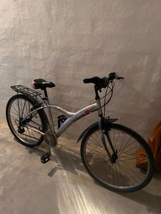 Bicicleta de paseo en color plateado con detalles en rosa. - Cuadro de aluminio. - Ruedas de 26 pulgadas. - Portabultos trasero. - Guardabarros delantero y trasero.