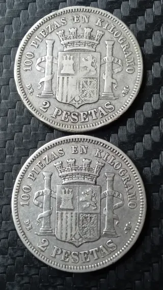 2 monedas de plata de 2 pesetas del Gobierno Provisional de 1870. Estrella 74. - Diseño con escudo de España. - Inscripción 100 PIEZAS EN KILOGRAMO. - Leyenda 2 PESETAS en la parte inferior.