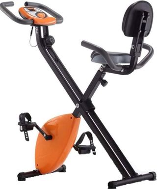 Bicicleta estática fitness equipament mugar de color naranja y negro, con diseño plegable para facilitar su almacenamiento. - Asiento con respaldo. - Pantalla digital. - Pedales con agarre.