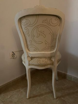 Elegante silla de estilo Luis XVI, con un diseño clásico y refinado. - Tapicería en tela con estampado floral. - Estructura de madera tallada. - Acabado en color blanco y beige.