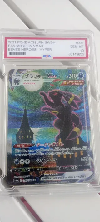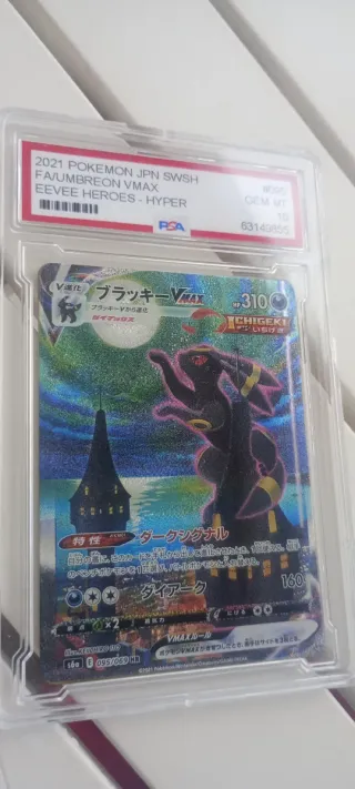 Carta para decoración solo Pokémon Umbreon VMAX del set Eevee Heroes de 2021, con una calificación PSA 10. - Edición Japonesa. - Grado GEM MT 10. - Número de serie: 63149855.