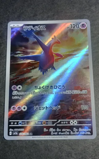 Carta Pokémon de Latios. - Ataque: Chokugeki Hikou (50 daño). - Ataque: Jet Head (110 daño). - Coste de energía: 2 cartas de tipo ojo y 1 carta de tipo estrella. - Debilidad: 30. - Resistencia: Ninguna. - Coste de retirada: 2 cartas de tipo ojo y 1 carta de tipo estrella.