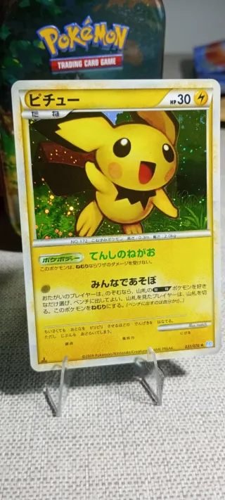 Carta Pokémon original de Pichu. - Número: 172 - HP: 30 - Habilidad: Tierno Corazón (Este Pokémon no recibe daño de ataques si está dormido). - Ataque: Juguemos Juntos (Los jugadores pueden elegir Pokémon de su baraja y ponerlos en la banca. El jugador que miró la baraja baraja su mano. Duerme a este Pokémon. Poner en la banca es por tu cuenta.). - Descripción: Aunque pequeño, tiene una electricidad que puede hacer cosquillas a los adultos. Sin embargo, también se sorprende a sí mismo.