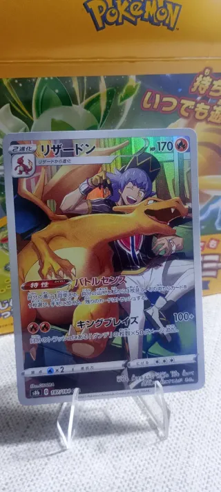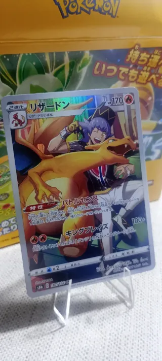Carta Pokémon de Charizard VMAX. - Carta de 170 HP. - Ataque King Blaze con 100+ de daño. - Habilidad Battle Sense.