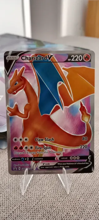 Carta Pokémon Charizard V, edición SWSH050. - Ataque Garra de Fuego (Claw Slash) con 80 de daño. - Ataque Giro de Fuego (Fire Spin) con 220 de daño. - Regla V: Tu oponente roba 2 cartas de Premio cuando tu Pokémon V es Derrotado. - Ilustración de Sban Graphics.