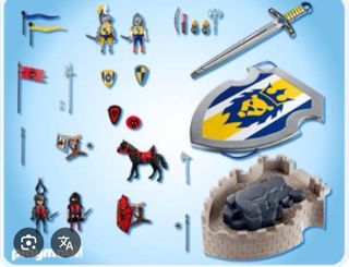 Set de Playmobil 4217, un castillo medieval con caballeros y accesorios. SIN CAJA Y SIN ESPADA !!!! - Incluye figuras de caballeros y caballos. - Cuenta con un castillo para construir y jugar. - Promueve el juego imaginativo y la narración de historias.