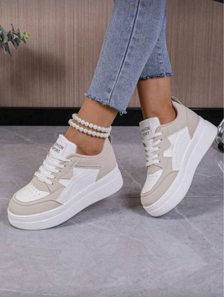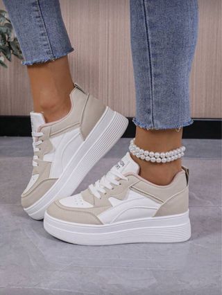 Zapatillas deportivas casual con plataforma para mujer, perfectas para el día a día. - Diseño de moda. - Combinación de colores beige y blanco. - Suela de plataforma gruesa.