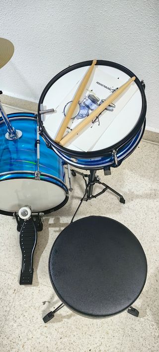 Batería junior de la marca Rocket Music, ideal para iniciarse en el mundo de la música. El set incluye varios tambores y un platillo. - Acabado brillante en color azul. - Incluye baquetas de madera. - Taburete negro. - Pedal de bombo.
