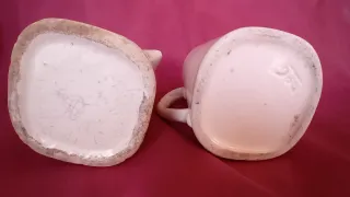 Par de jarras antiguas de cerámica, estilo vintage, con decoración pintada a mano. - Diseño floral en una jarra. - Motivos geométricos y vegetales en la otra. - Piezas decorativas con encanto.