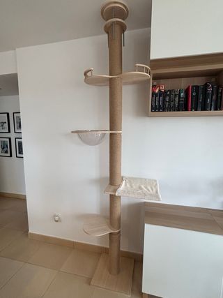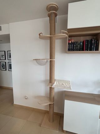 Este árbol rascador para gatos ofrece múltiples niveles para que tu mascota juegue y descanse. - Estructura alta con varias plataformas. - Incluye una hamaca o cama. - Diseño moderno y funcional.