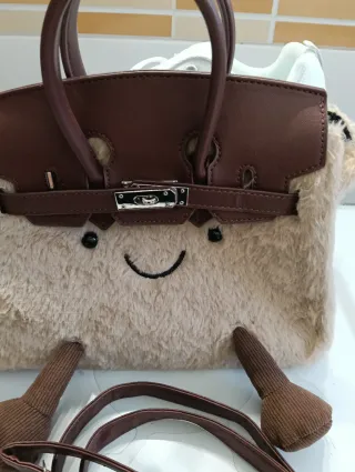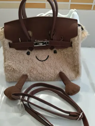 Bolso de peluche con un diseño divertido y original. - Material exterior de pelo sintético. - Detalles de cara sonriente bordada. - Asas superiores y correa ajustable. - Acabado en piel sintética marrón.