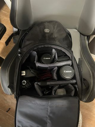Mochila negra para cámara de fotos, ideal para transportar tu equipo de forma segura. - Canon E0S 600D - Objetivo 18-55mm - Objetivo 75-300mm - Cargador Batería + Batería de repuesto - Compartimentos acolchados y personalizables. - Bolsillo frontal con cremallera. - Correas de hombro ajustables.