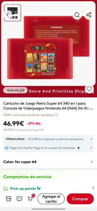 Cartucho de juegos retro para Nintendo 64 con 340 títulos incluidos. - Nuevo a estrenar, sin abrir - Incluye tarjeta MicroSD. - Más de 300 juegos sumando EUR, USA, JAP... - Diseño en color rojo. - Compatible con consolas Nintendo 64 (N64). - PAL y NTSC - Carga instantánea