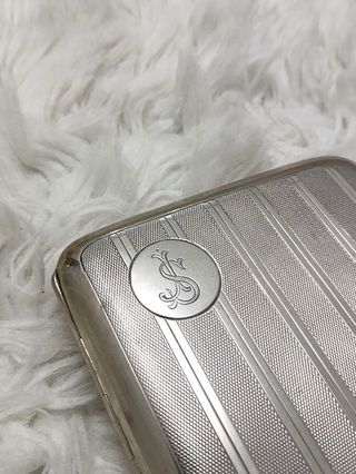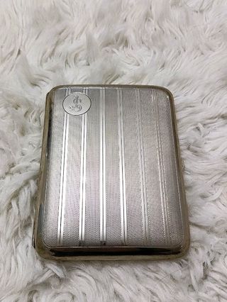 Elegante pitillera antigua de plata 800 Datada alrededor de 1910 Interior bañada de oro Presenta un diseño clásico con líneas verticales grabadas y un medallón circular con iniciales. - Material: Plata 800. - Época: Circa 1910. - Diseño: Rayas verticales y medallón con iniciales. - Medidas: 14 cm x 11 cm