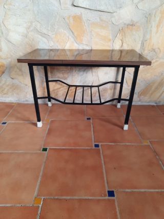 Mesa auxiliar compacta y práctica, ideal para espacios reducidos. Su diseño combina la calidez de la madera con la resistencia del metal. - Tablero de madera con acabado natural. - Patas metálicas plateadas. - Diseño plegable para fácil almacenamiento.