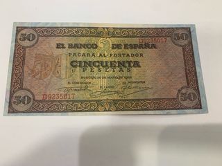Excelente estado de conservcion Billete de 50 pesetas del Banco de España, emitido en 1938. Presenta un diseño detallado con un castillo. - Emisión: 1938 - Denominación: 50 Pesetas - Banco emisor: Banco de España - Diseño: Castillo