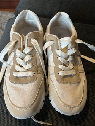Zapatillas de estilo casual en color beige. - Cierre con cordones. - Detalle de ante. - Suela de goma. - Me quedan un pelin pequeñas porque yo uso 38.5 pero me fustaron tanto y no habia 39 y me las cogi pero me da el dedo en la punta.
