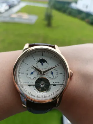 Elegante reloj Lige automático con corazón abierto y complicaciones de día de la semana, día/noche y hora en formato 24h. La esfera es texturizada, trasera de exhibición con rotor personalizado por la marca y correa con cierre deployante firmada. Diámetro del reloj 43mm sin corona y espesor 14mm. #seiko, #orient, #citizen, #oris