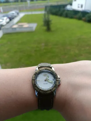 Reloj de pulsera con un diseño clásico y resistente. - Bisel con detalles en dorado. - Correa de cuero marrón. - Esfera blanca con detalles luminosos. #orient, #seiko, #citizen, #oris