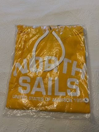Sudadera de la marca North Sails, con un diseño llamativo en color amarillo. - Talla L. - Ancho de hombros 50 - Largo 67 - Estampado Nautica Sails en blanco. - Detalle United States of America 1958. - Con capucha y bolsillo central