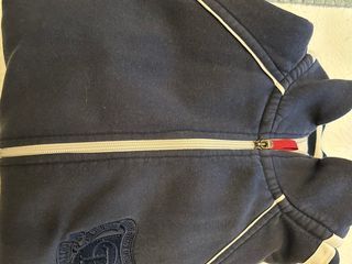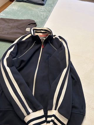 Sudadera para hombre con un diseño moderno y cómodo. - Cremallera frontal. - Detalles de ribete en contraste. - Escudo bordado en la parte superior. - Bandas blancas en las mangas