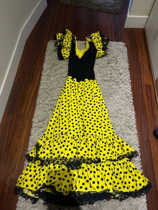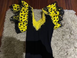 Traje de flamenca con un diseño vibrante y llamativo. - Cuerpo negro con escote adornado. - Falda larga amarilla con lunares negros. - Volantes en las mangas y en la falda. - Detalles de encaje negro en los volantes. - Tiene un poco mal los flecos amarillos del cuello