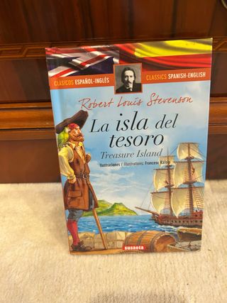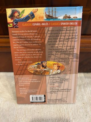 Libro clásico de aventuras de Robert Louis Stevenson en edición bilingüe español-inglés, ideal para aprender inglés o lectura juvenil. Editorial Susaeta, colección Clásicos Español-Inglés. Incluye ilustraciones a color. 📚 Tapa dura 📖 Buen estado general (ver fotos) 🔤 Texto en español e inglés