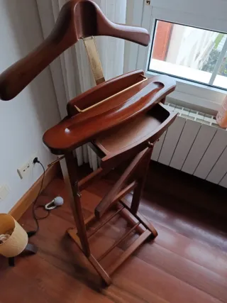Elegante perchero de noche para organizar tu ropa y zapatos listos para el día siguiente. - Diseño clásico en madera. - Bandeja superior para llaves o similar. - Barra para pantalones móvil para dejarlos y que no se arruguen. - Base para zapatos. - Cepillo. - Se le puede colgar un quita pelos tal y como se ve en la foto. Tiene ruedas para desplazarlo cómodamente. Ropa y calzado no incluido, es solo para las fotos.