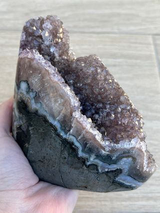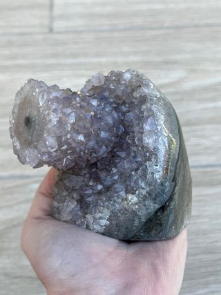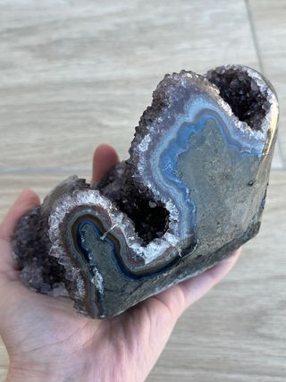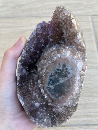 Geoda de amatista de Uruguay con formación de flor de estalactita. Tiene algo de ágata en los laterales. Precio no negociable. 906 gramos