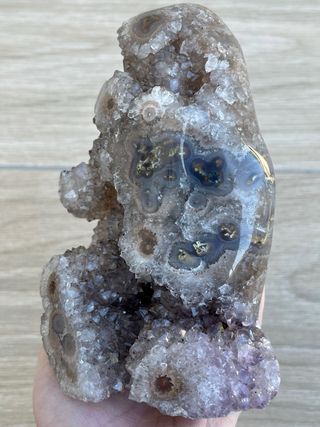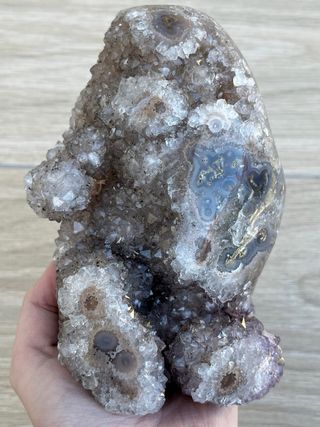 Geoda de amatista marrón de Uruguay con varias formaciones de flor de estalactita. La parte de atrás es de ágata. Precio no negociable. 867 gramos
