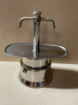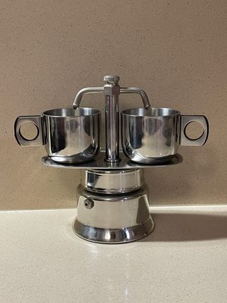 Cafetera, perfecta para aventureros, ya que es muy práctica, pesa poco y sirve para cualquier tipo de fuente de calor. Ademas las tazas son de doble capa, lo que aguanta mejor la temperatura. O para coleccionistas por ser una pieza de colección de diseño retro industrial impecable. Fabricada en acero inoxidable 18/10 Sistema de doble boquilla que sirve el café recién hecho directamente en las tazas (incluidas). Sello de Autenticidad: La base incluye el grabado original de la marca, certificando su origen y materiales. Imperial Metal Company.