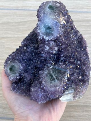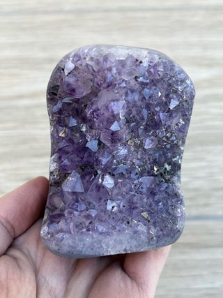 Solo venta en persona. Geoda de amatista morada Brasileña en peana a medida. Tiene una pequeña zona dañada en la esquina superior. Precio no negociable. 546 gramos peana incluida