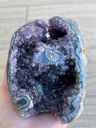 Geoda de amatista morada de Brasil con ágata en los lados. 264 gramos Precio no negociable.