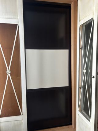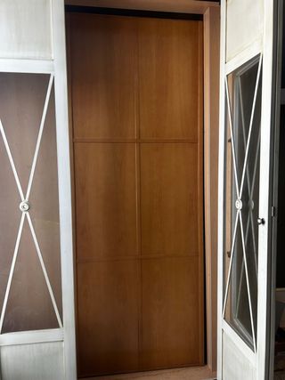 Armario de estilo clásico con puertas que combinan cristal y madera. Las puertas son desplegables. EL INTERESADO LO DESMONTA Y SE LO LLEVA. El armario esta en un local a pie de calle, facil de llevar. - Diseño con paneles superiores de madera. - Paneles inferiores con cristal y detalles decorativos en forma de X. - Tiradores metálicos.