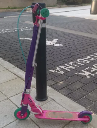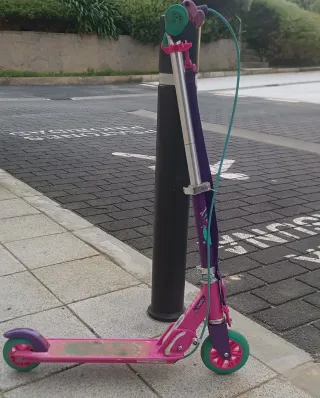 Patinete infantil de la marca Oxelo, ideal para los más pequeños. Su diseño combina colores vibrantes para hacerlo atractivo. - Color principal: morado. - Detalles en rosa y verde. - Ruedas de color verde. - Plataforma antideslizante.